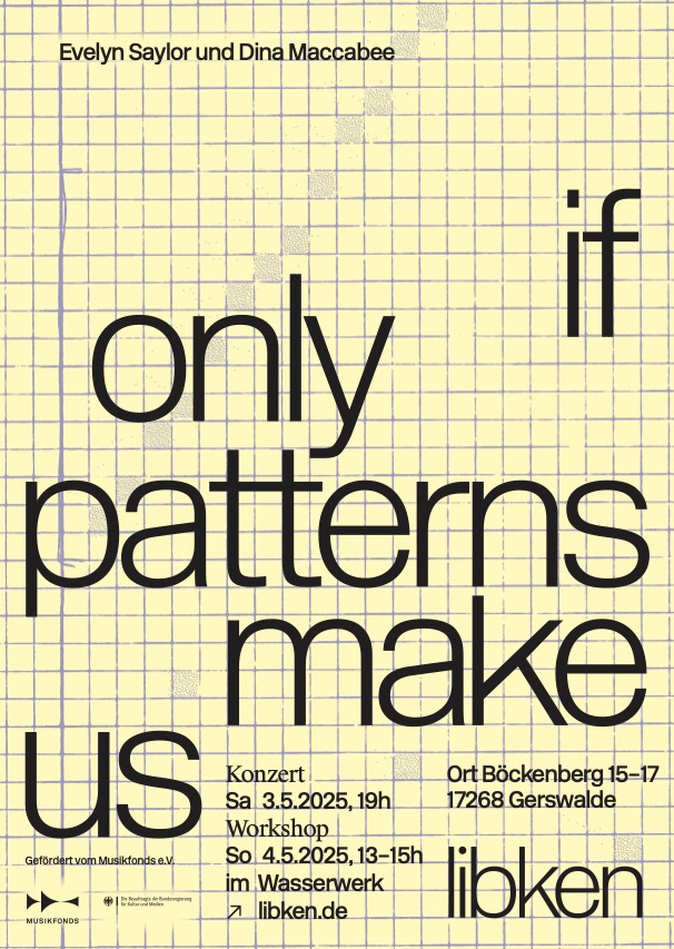 On April, 4th, we sing at KM28 in Karl-Marx-Straße 28, 12043 Berlin and on May 3rd in Libken, accompanied by a workshop on the next day. If Only Patterns Make Us gathers pieces for two, a capella and accompanied voices, as well as for a mixed vocal ensemble. The new works of Evelyn and Dina reflect their multi-faceted engagement across contemporary and folk singing practices.